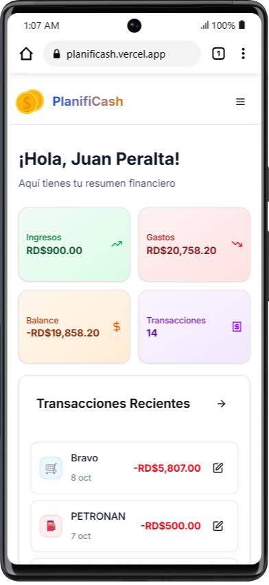 PlanifiCash es tu herramienta financiera personal que te permite gestionar transacciones, crear presupuestos por categoría y analizar tus finanzas con un dashboard intuitivo y métricas detalladas.